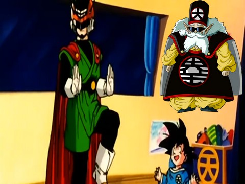 神 - Este é o ideograma pertencente ao Kami Sama (Piccolo). O ideograma significa "Kami" ( かみ, "deus" ou "espírito do bem"). Dende também o usa a partir da saga de Buu, capítulo 426 do mangá, mas todas as aparições seguintes de Dende já o mostra novamente sem o ideograma.