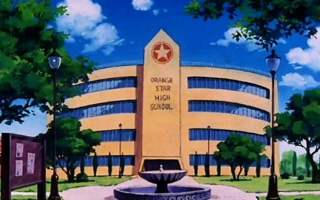 Este é o logotipo da Orange High School, onde Gohan e Videl estudam. Os alunos usam um broche com o símbolo da escola em suas roupas, de modo que sejam reconhecidos como alunos da escola.